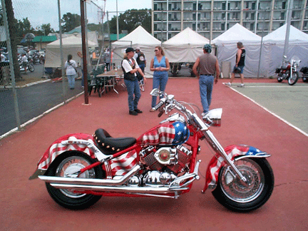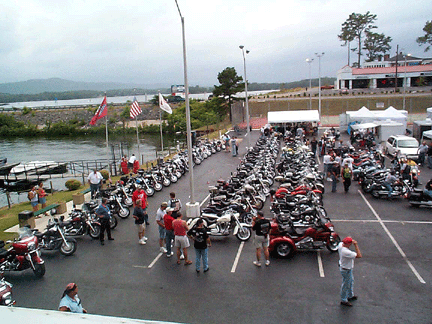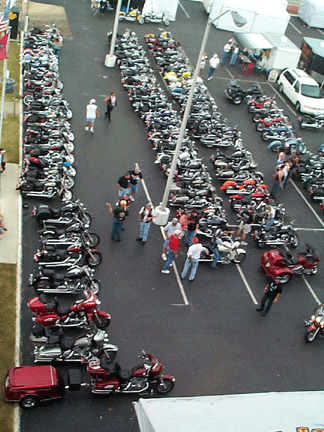 Around 4:30 pm, the Flaunting of the Stars began. After the past two Cruise-Ins, some questions had been raised about the number of bikes actually present, so the Flaunting pictures will allow anyone to decide for themselves. The picture on the left shows the remaining bikes after the lines had been set up. Other bikes were out being ridden, but the majority were in the parking lot. The two middle pictures were taken from the top of Baron's trailer and the others from my sixth floor balcony.
